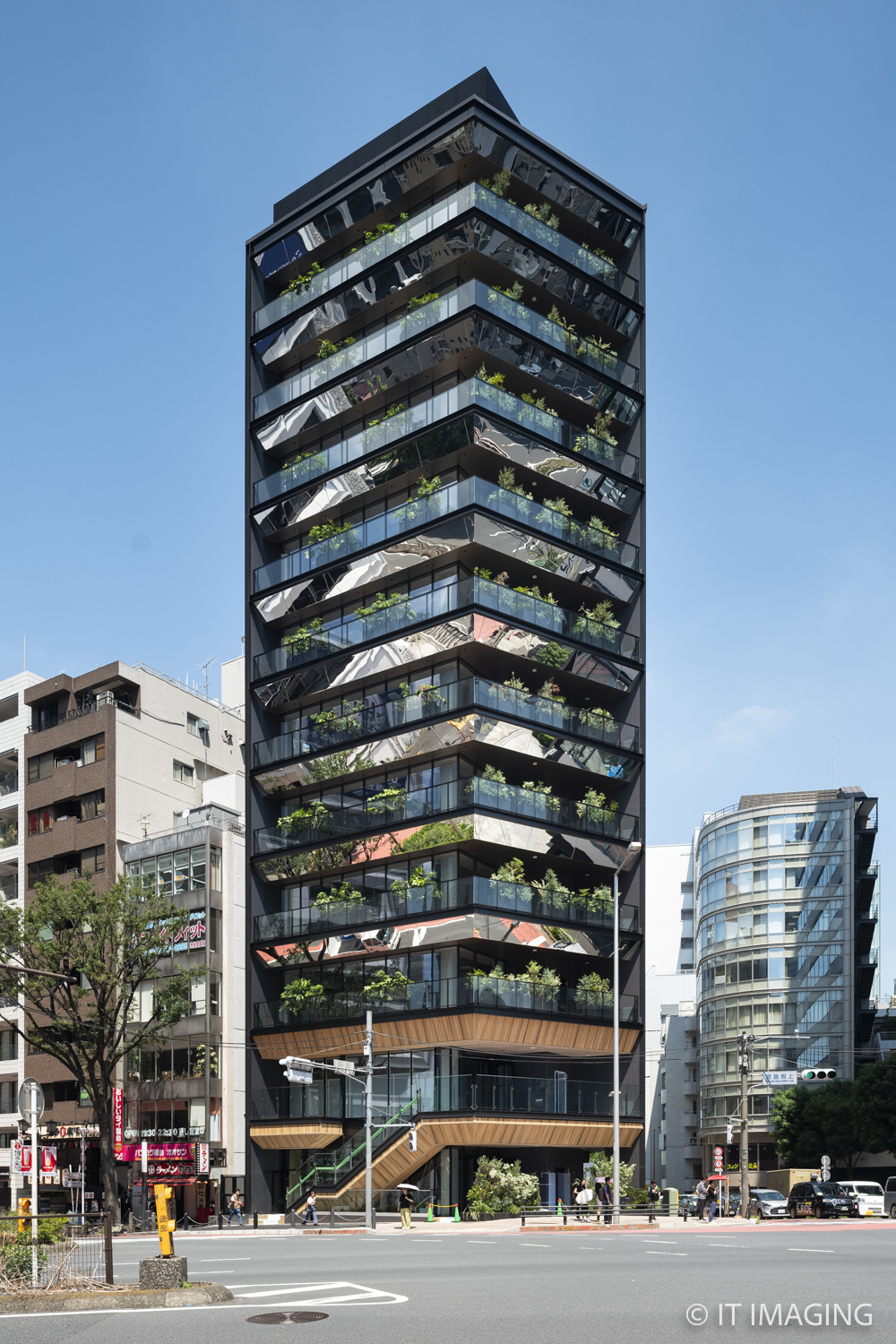 低層階には飲食店などの商業施設を配置。さらに、斜線制限に合わせて三角形のバルコニーを設けることで階数を最大限に確保し、建物の価値を高めました。