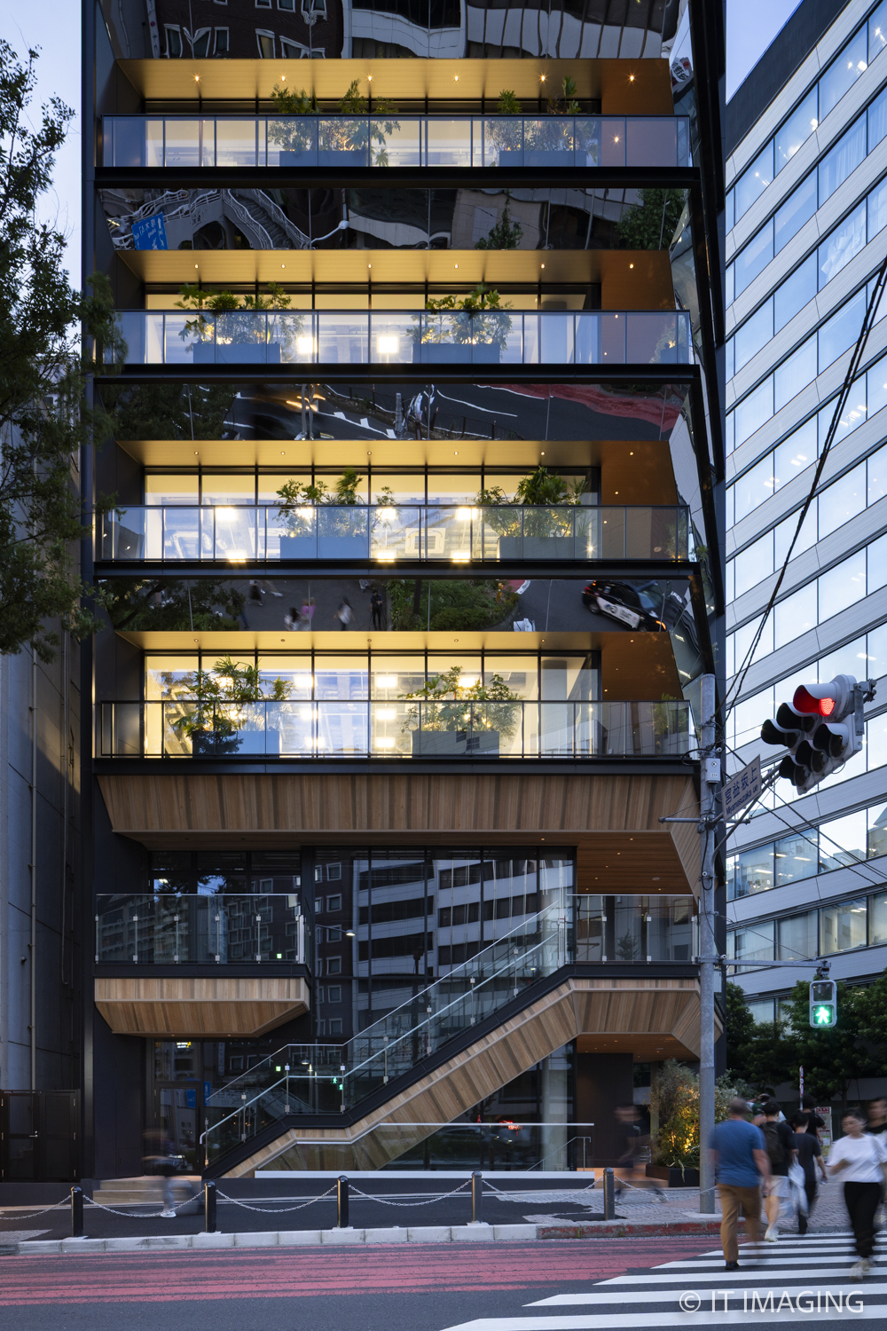 角地の象徴となるよう、外観には鏡のように周囲の景色を映し出すSUS鏡面パネルを採用し、再開発で変化する渋谷のまちの風景や行き交う人々を映し込み、まちと呼応するファサードを目指しました。