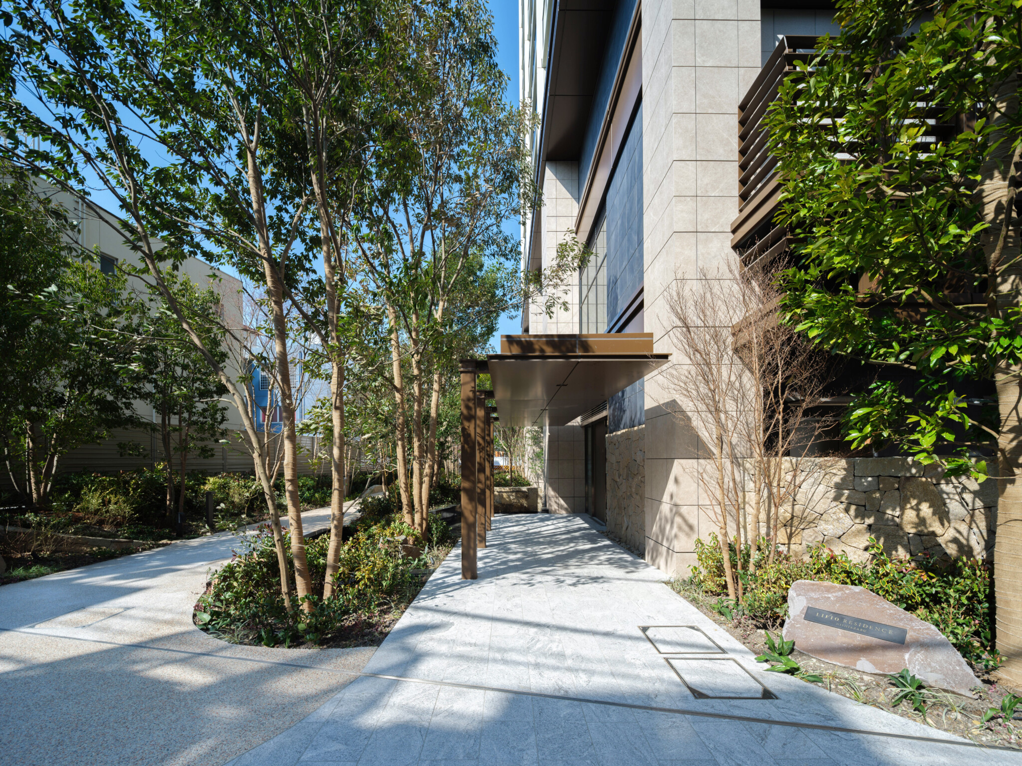ランドスケープでは、六本木通りの喧騒を忘れさせるため、曲線を多用した有機的なアプローチを採用。低木から高木までを豊かに配し、屋敷林のような緑豊かな設えにしています。