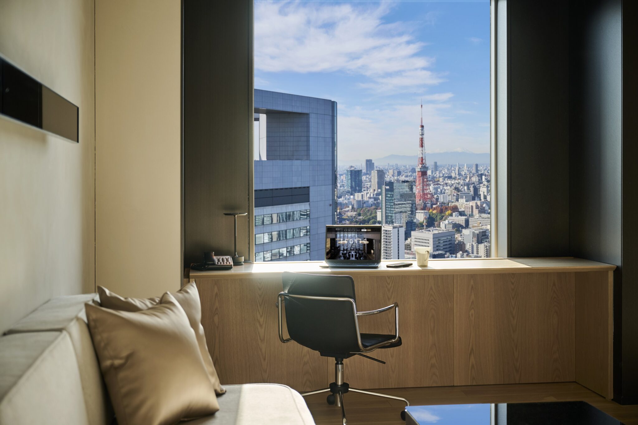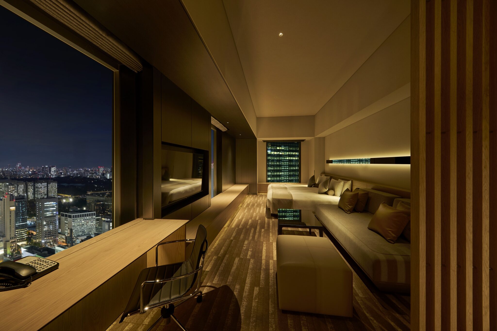 客室にはガラスの間仕切りやティーテーブル、ミラーアートを配し、東京の美しい夜景が映り込む幻想的な空間でゲストをもてなします。窓まわりには、光沢感のある金属調の黒い仕上げを用いて、外の景色を枠として切り取り、絵画のように都市の風景を楽しめます。